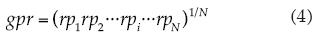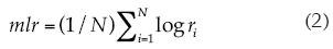 siendo ri el i-ésimo valor de r y N el número de datos. Dicho índice varía en el intervalo (0, + ∞), indicando menor discrepancia cuanto más cercano sea su valor a 1. También se usó la media aritmética del logaritmo de r (mlr):