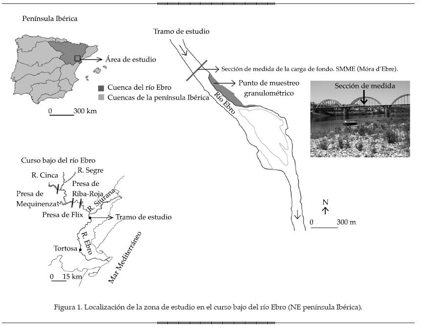 La hidráulica del flujo y el transporte de sedimento fueron medidos de forma regular y continua durante las crecidas en la sección de muestreo de Móra d'Ebre (SMME) durante el periodo 2002-2004. Esta sección de registro se ubica 27 km aguas abajo de la presa de Flix y en ella el ancho del cauce es de 160 m (figura 1). A lo largo de este tramo de registro el río muestra un cauce único y de baja sinuosidad, siendo su pendiente longitudinal media de 8.5·10-4 m·m-1. En dicho tramo, el cauce del río puede concebirse como un canal de ensayos natural, válido para el estudio de los cambios en la superficie del lecho en función del transporte de fondo. La coraza que se ha desarrollado controla la movilidad del sedimento y la estabilidad del cauce, siendo el acorazamiento una expresión de la limitación de la disponibilidad del sedimento proveniente de los tramos aguas arriba y de la frecuencia de ocurrencia de los flujos competentes. En este apartado se presenta un breve resumen de la metodología de adquisición de datos con la que se caracterizó el sedimento del lecho del río y se midió el transporte de fondo en la SMME. Una descripción pormenorizada de dicha metodología puede consultarse en Vericat y Batalla (2006), Vericat, Batalla y Garcia (2006), y Vericat, Church y Batalla (2006).
