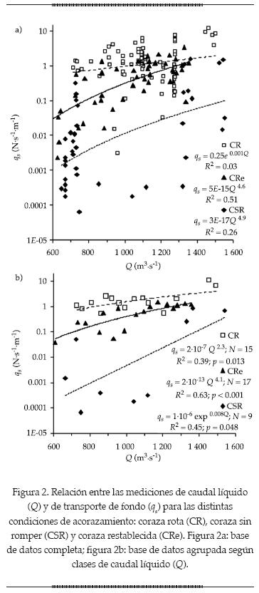 En la figura 2a se ha representado la relación entre las mediciones de caudal líquido (Q) y de transporte de fondo (qs, expresado en unidades de peso) para los tres conjuntos delimitados por la condición de acorazamiento (DEC). En el cuadro 2 se especifica el número de datos que integran cada uno de los tres conjuntos. La figura 2a desvela un elevado grado de dispersión de los datos; es decir, dado un valor de Q, se registra un amplio intervalo de variación en el valor de qs (dicho intervalo puede alcanzar una amplitud de incluso varios órdenes de magnitud). El fenómeno de la alta fluctuación temporal de la carga de fondo ha sido ampliamente descrito, incluso en condiciones (medias) de flujo constante, como consecuencia de estocasticidad, migración de formas de fondo, clasificación granulométrica, histéresis o limitación de la disponibilidad de sedimento (p. ej., Recking, Liébault, Peteuil, & Jolimet, 2012). En la figura 2a, las curvas de regresión de los conjuntos CR y CSR discurren en extremos opuestos, representando diferentes condiciones de suministro del material sólido de fondo o fases del transporte. Dado un valor de caudal, una mayor carga de fondo se espera para condiciones CR que para CSR, pues la primera representaría la fase de transporte 1 y la segunda una fase 2 o 3. La curva de regresión de la condición CRe transcurre entre ambos extremos, representando una situación intermedia. Todas estas observaciones deberían considerarse con precaución, habida cuenta del bajo valor del coeficiente de determinación (R2) de las curvas de regresión, en especial la correspondiente al conjunto CR. En este sentido, una de las técnicas que pueden utilizarse para suavizar el efecto de la fluctuación de la carga de fondo y la consiguiente dispersión de datos es la agrupación de dichos datos en clases de la variable independiente (en este caso, Q). En el presente estudio se agruparon los datos de los tres conjuntos en clases cuya amplitud de intervalo correspondía a 40 m3·s-1, asignando a cada clase un único valor calculado como el promedio aritmético de los datos incluidos en la clase. En el cuadro 2 se especifica el número de datos que constituyeron cada conjunto según la agrupación descrita. En la figura 2b se observa que la agrupación por clases conllevó una atenuación importante de la dispersión y, en consecuencia, el valor de R2 de las curvas de regresión de los tres conjuntos se incrementó de manera notable (en especial el de CR). Puede apreciarse cómo la posición relativa de las tres curvas se mantiene respecto a la de la figura 2a.