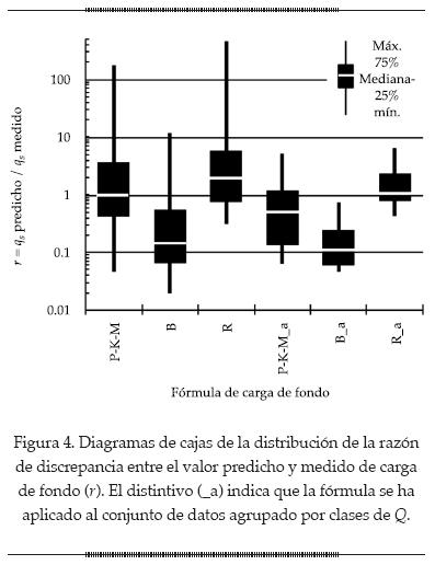 denotando rp un valor de r ponderado por la potencia del caudal sólido de fondo medido (rp = rqsm) y donde se tomó el valor inverso de rpi si rpi < 1, para asegurar que gpr ≥ 1. El índice, así definido, varía en el intervalo (1, + ∞), indicando menor discrepancia cuanto más cercano sea su valor a 1.