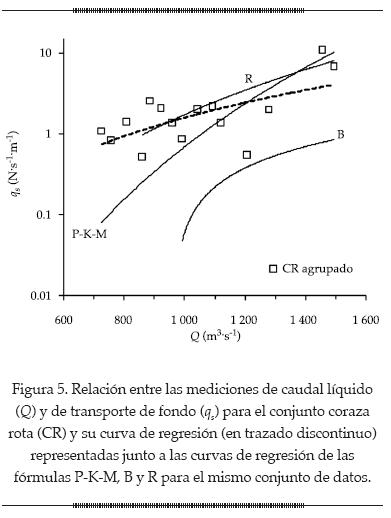 Más allá del grado de ajuste concreto entre medición y predicción, es de interés conocer si una fórmula tiende a la sobrepredicción o la infrapredicción del transporte de fondo. En las figuras 3 y 4 se observó la acusada tendencia de la fórmula B a predecir valores de la carga de fondo inferiores a los medidos. Igualmente la fórmula P-K-M mostró tendencia a la infrapredicción, aunque en un grado mucho más moderado. Por último, la fórmula R tendió a sobrestimar las mediciones de carga de fondo, aunque con un sesgo también comparativamente leve. Las tendencias descritas lo son en términos generales, es decir, abarcando e integrando toda la amplitud del intervalo de carga de fondo medida. Sin embargo, resulta también de utilidad conocer si la tendencia varía en función de la magnitud de otras variables correlacionables con la carga de fondo, por ejemplo, el caudal líquido. Para ello, en la figura 5 se representaron, en función del caudal líquido medido (Q), los datos del conjunto de condición CR (subconjunto agrupado), su curva de regresión y las curvas de regresión correspondientes a las tres fórmulas evaluadas. La figura 5 develó claramente: la infrapredicción sistemática de la fórmula B para todo el rango de caudal, que para caudales inferiores a aproximadamente 1 100 m3/s, la fórmula R es la que más se ajustó y que para caudales superiores a dicho valor se dio poca diferencia entre las predicciones de las fórmulas P-K-M y R.