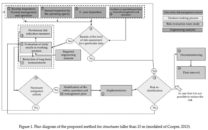 Of the approximately 4 500 dams currently in Mexico, 836 are taller than 15 m, and only 27% are federal property (Bowles, 2013; Conagua, 2011; Arreguín et al., 2013). A methodology for the development of a risk portfolio is proposed for existing dams; this methodology considers the definition and management of risk and decision making and must encompass at least dams with a height above 15 m. Furthermore, in the development of such a risk portfolio, it must be considered that an important fraction of the dams are private property and/or have been abandoned. Those dams require special judicial measures. Figure 1 shows a flow diagram for the proposed method for storage or control structures taller than 15 m.
