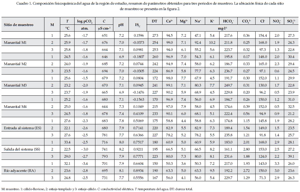 Los parámetros fisicoquímicos de campo, como alcalinidad, dureza total y CO2 disuelto, se determinaron in situ con un equipo portátil HACH FF-2; la temperatura y conductividad eléctrica, con un equipo YSI 3010FT y el pH, con un equipo YSI 6010FT. Estos dos últimos parámetros se midieron de forma continua con anticipación a la toma de muestra y sólo se procedió con el muestreo cuando sus valores se estabilizaron al menos durante 15 minutos. Para la caracterización del agua se consideraron como elementos mayoritarios los cationes Ca2+, Mg2+, Na+ y K+, determinados por espectrofotometría de absorción atómica con un equipo Spectra 600, mientras que los aniones HCO3-, Cl-, SO42-y NO3- se identificaron mediante espectrofotometría UV/VIS en el Laboratorio de Calidad del Agua del Centro Interamericano de Recursos del Agua (CIRA). Las muestras para análisis de cationes fueron acidificadas de modo conveniente in situ con un valor de pH de 2 con HNO3. Por último, la estimación de la electroneutralidad sólo incluyó los balances iónicos con márgenes de error menores al ±10%, siendo aceptables, de acuerdo con Güler, Thyne, Mccray y Turner (2002), para los propósitos de este estudio.