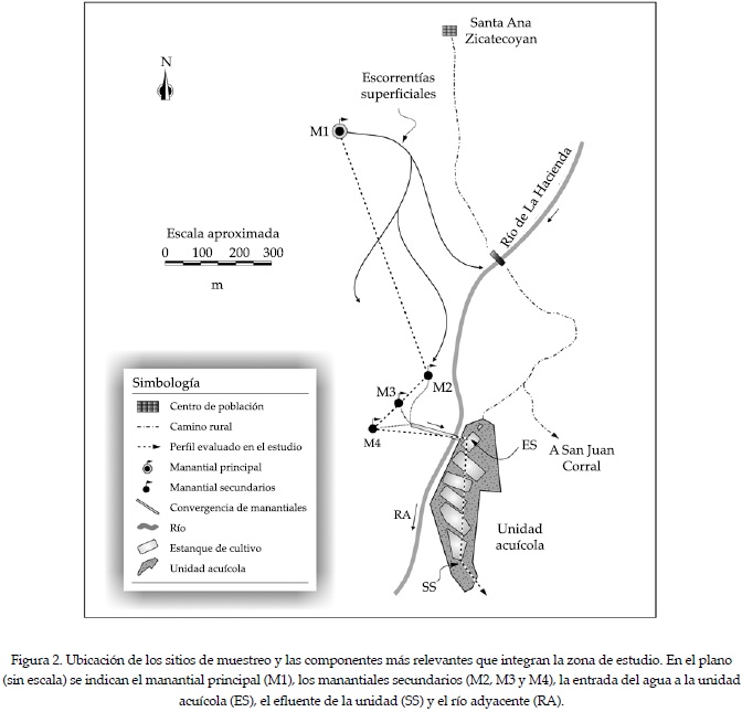 Posteriormente, hacia la entrada del sistema (ES) convergen los flujos parciales procedentes de los manantiales descritos con destino al abastecimiento de la unidad acuícola, la cual se encuentra estructurada por un conjunto de siete estanques interconectados en desnivel, que tienen como efluente general de la unidad la salida del sistema (SS). Por último, el río adyacente (RA), considerado como punto de referencia, corresponde a un cauce superficial de carácter permanente inmediato a la unidad acuícola que, en dirección norte-sur, atraviesa de forma longitudinal la zona de estudio. Este curso de agua recibe aportes parciales del manantial principal (M1), que se combinan con los vertidos intermitentes domésticos, así como de la ganadería de pequeña escala de la zona (figura 2).