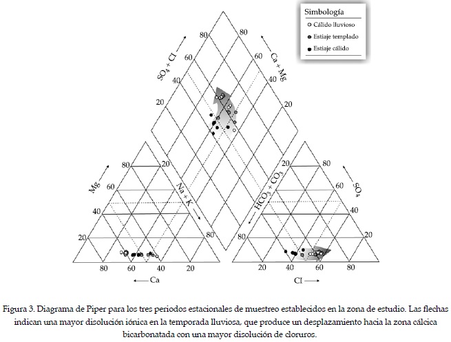 En este sentido, el agua de los manantiales se caracteriza cualitativamente como bicarbonatada-cálcica-clorurada-sódica (HCO3-Ca-Cl-Na), que evoluciona desde el punto de vista temporal del tipo HCO3-Ca-Na en el estiaje cálido, al tipo HCO3-Ca-Na-Cl para la estación cálido lluviosa (figura 3). Su composición, vinculada con la litología predominante, típica de los sistemas kársticos, se modifica con la intensificación de la recarga del acuífero en la temporada lluviosa, en la cual ocurre un desplazamiento del agua subterránea de mayor mineralización debido al proceso de karstificación. Además de la vinculación con la litología, el agua subterránea también es susceptible de experimentar una evolución fisicoquímica espacial o temporal resultante de las interacciones complejas del proceso de recarga, el tipo de flujo y el almacenamiento, siendo el tiempo de residencia un factor determinante. Por otra parte, el grado de mineralización del agua en los sistemas kársticos depende del volumen de recarga, si ésta es dispersa o concentrada, y del componente gaseoso del subsuelo (CO2) dependiente de la actividad biológica y la temperatura.