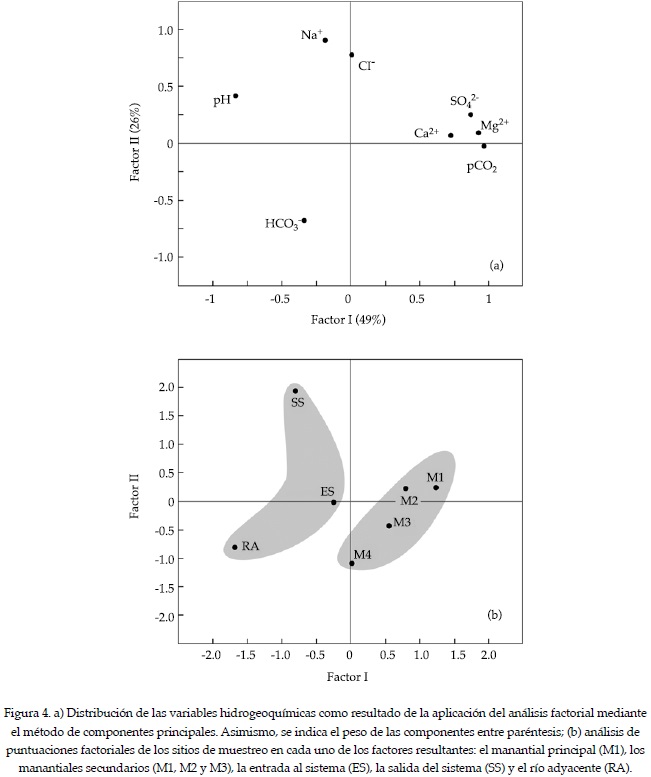 La composición iónica del agua en los manantiales evoluciona espacialmente durante el tránsito y descenso del agua a través de las escorrentías superficiales, canalizaciones y entubamiento de las surgencias (M1, M2, M3 y M4) en dirección a la unidad acuícola (ES), a la salida (SS) y en el río adyacente (RA) (figura 4b), debido fundamentalmente a la pérdida en la pCO2 que a causa de la aireación y la turbulencia del agua tiende a equilibrarse con la presión atmosférica. En tal sentido, las puntuaciones factoriales obtenidas del análisis multivariado aportan información visual conveniente acerca de la evolución hidroquímica espacial en este sistema kárstico. En la gráfica 4b, los sitios de muestreo se concentran en dos grupos que hacen una distinción del nivel de mineralización del agua: a la derecha, el correspondiente a los manantiales y a la izquierda el de las aguas sujetas a condiciones atmosféricas. En el primer grupo predominan condiciones de mayor mineralización, definidas por un pH bajo; en cambio, a la izquierda se agrupan las aguas menos mineralizadas, que han experimentado procesos que incrementan la alcalinidad y pérdida de pCO2.