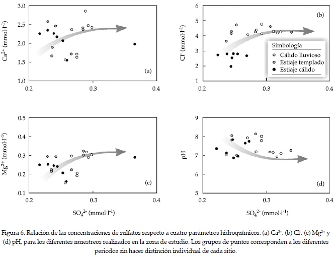 La figura 6 presenta la evolución, desde el punto de vista temporal, de los indicadores que definen la mineralización del agua en la zona de estudio. En estas gráficas se destaca, por una parte, la relación cercana entre el contenido de sulfatos respecto a los iones Ca2+ y Mg2+-(figuras 6a y 6b), misma que ha sido identificada en el análisis factorial de la figura 4a..La relación entre sulfatos y cloruros es indicador de una mayor disolución mineral hacia la temporada lluviosa (figura 6c), sin embargo, la distancia existente entre ambos indicadores en el ACP (figura 4a) sugiere un origen que no se limita solamente al sustrato evaporítico (yeso y anhidrita), por lo que puede atribuirse también a la presencia de halita. Asimismo, se presenta la relación inversa entre el contenido de SO42-disueltos y el pH (figura 6d). Este enfoque gráfico sustenta la disolución mineral originada en la recarga hídrica, la cual se encuentra cercana a la saturación respecto a los minerales carbonatados, como es el caso de la calcita y la dolomita. En este proceso, la disolución adicional de anhidrita, aunada al incremento de las concentraciones de Ca2+ y Mg2+ en el agua de las surgencias es indicadora de la ocurrencia de procesos de precipitación, en los que la liberación del ion H+ del HCO3-, por efecto de la incorporación del ion CO32- de los minerales carbonatados da como resultado un incremento del H2CO3 en solución, al cual puede adjudicarse la disminución del pH.