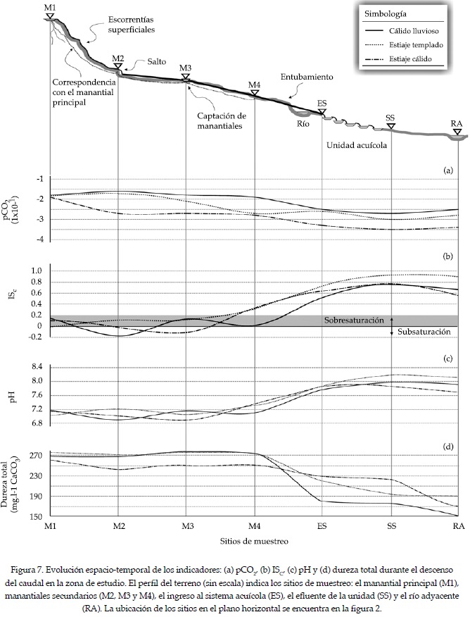 En la figura 7c se puede apreciar que la neutralidad del pH para los manantiales (M1 a M4) (pH 6.9-7.2) evoluciona hacia la entrada del sistema (ES) a 7.1-7.4 debido al entubamiento de las surgencias. Posteriormente, la aireación y turbulencia del agua a través de la estanquería favorece el equilibrio de pCO2, situando al pH entre 7.8-8.2 hacia la salida del sistema (SS). Valores similares de pH han sido observados durante la evolución geoquímica en corrientes kársticas sobresaturadas respecto al ISC. Wicks y Engeln (1997) encontraron valores de pH entre 8.26 a 8.34 en corrientes superficiales proveniente de acuíferos kársticos; Chen et al. (2004) observaron que el pH en las corrientes sobresaturadas respecto a la ISC puede incrementarse hasta 8.1; Herman y Lorah (1987) reportaron valores de pH de 8.17 a 8.43 en estudios de precipitación de la calcita debidos a la desgasificación del CO2.