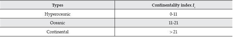 The continentality index varies between Ic = 0 for an extreme oceanic influence, to Ic = 65 for an extreme continental influence.
