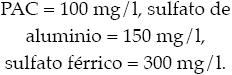 Se evaluaron tres coagulantes: sulfato de aluminio (Al2(SO4)3.16H2O) marca AnalaR, sulfato férrico (Fe2(SO4)3.5H2O) de igual procedencia y un coagulante comercial de la firma Prosifloc (policloruro de aluminio en polvo PAC); los tres coagulantes se estudiaron en un intervalo de dosis entre 50 y 400 mg/l.