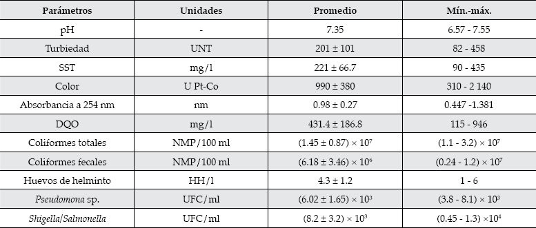 En el Cuadro 1 se presentan los valores promedios y sus respectivas desviaciones estándar, así como los valores mínimos y máximos de los parámetros físico-químicos y microbiológicos del agua residual durante el periodo de estudio. Al analizar estos valores se puede observar que la mayor contaminación es debida a partículas y coloides en suspensión que aportan al agua una elevada turbidez y color aparente, así como una considerable presencia de organismos patógenos.