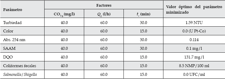 La importancia del flujo de gas y de la concentración de ozono en el mismo también se ve reflejada en el Cuadro 2, donde se muestran los resultados de la optimización local de los factores de ozonización, con un criterio de mi-nimización de cada contaminante en el proceso. Se observa que para reducir al mínimo estos contaminantes es necesario aplicar la mayor concentración y flujo de gas evaluado, no siendo así para el tiempo de contacto, donde en varios casos sólo es necesario 15 minutos de ozonización. Esto último es importante si se tiene en cuenta que la mayor contaminación que llega a esta etapa de tratamiento es por microorganismos patógenos, que de acuerdo con los resul tados obtenidos son eliminados con un menor tiempo de ozonización, permitiendo reducir las dosis de ozono y el costo del tratamiento.
