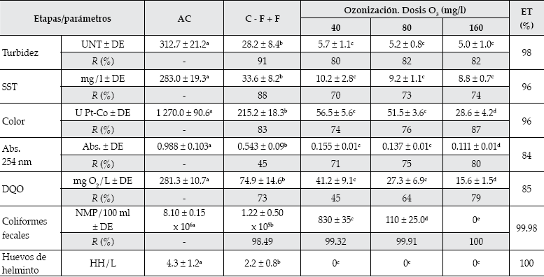 En el Cuadro 4 se muestra la comparación estadística de los resultados obtenidos con la aplicación de tres dosis de ozono (40, 80 y 160 mg/l), en la reducción de los contaminantes físico-químicos y microbiológicos presentes después del proceso de coagulación-floculación y filtración.
