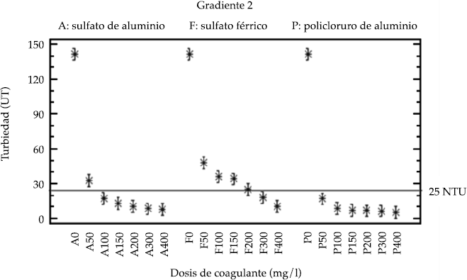En la Figura 2 se presentan los resultados de las condiciones experimentales evaluadas para el gradiente 1 de velocidad de agitación. Debido a que posterior a esta etapa de tratamiento existen otras etapas que disminuyen aún más la turbiedad del agua, se decidió escoger como dosis mínima de cada coagulante la que estuviera por debajo de 25 unidades nefelométricas de turbiedad (UNT). Las muestras iniciales (0), para los muestreos realizados con sus réplicas se consideran homogéneas.