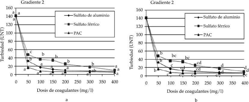 En las Figuras 3 (a y b) se muestra la comparación estadística de los valores promedios de turbiedad entre los tres coagulantes para cada dosis y entre cada una de las dosis para cada coagulante para el gradiente 1.