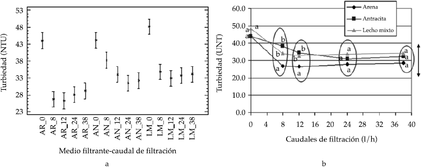 En la Figura 8 (a y b) se muestra la influencia de los tres medios filtrantes (a) y los caudales de filtración (b) evaluados en la retención de partículas que aportan turbiedad al agua. Se observa que en todas las condiciones experimentales se logran reducciones de turbiedad con diferencias significativas con respecto a la muestra inicial, por lo que se considera una buena etapa de seguridad para retener partículas que no fueron sedimentadas en el proceso de coagulación-floculación. En el caso de los menores caudales de filtración (8 y 12 l/h), se logra una mayor reducción de turbiedad con la filtración por arena, con diferencias significativas con respecto a los otros medios filtrantes. Esta diferencia es importante para escoger el medio filtrante si se decidiera utilizar un filtro lento por gravedad.