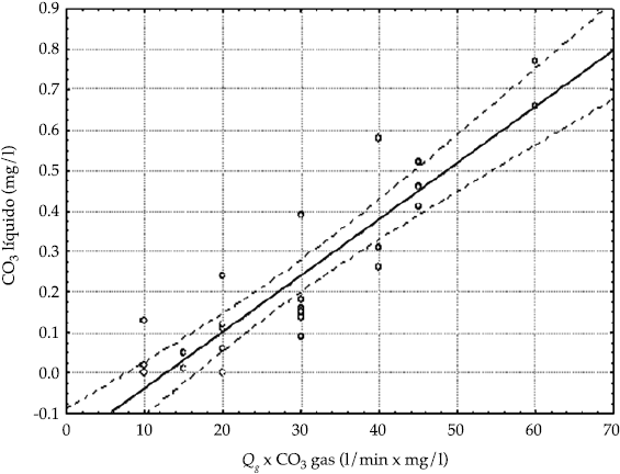 Este modelo permite estimar las concentraciones promedio de ozono disuelto que se obtendrían con la aplicación de la combinación del flujo de gas y la concentración de ozono en el gas, para este tipo de agua residual que previamente se trató por procesos de coagulación-floculación y filtración. Esta estimación también se puede realizar empleando el gráfico de la Figura 9 para un 95% de confianza.