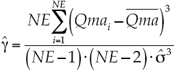 Para los datos de la columna 3 del Cuadro 2 se obtiene que su coeficiente de asimetría es 2.0303, lo cual conduce a un valor de K = -0.3104. Con base en estos valores y los citados anteriormente, se obtuvo que c0 = 88 468.7 y c1 = 27 7787.1, ambos con unidades de varianza (m6/s2). Los correspondientes factores de ponderación (ecuación (18)) se muestran en la columna 7 del Cuadro 2.