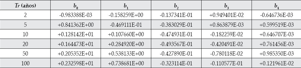 con a0 = -2 025.336, a1 = 26.55365, a2 = -1.122622E-02, a3 = 1.481098E-06, a4 = -4.118003E-11 y error estándar de la estimación de 9 315 m3/s. Con base en tal ecuación se obtuvieron los factores de ponderación (wi ) mostrados en la columna 11 del Cuadro 2.