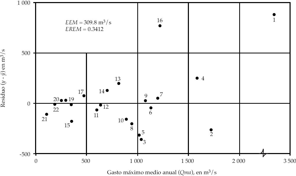 Al aplicar la técnica de MCP, con la función de ponderado mostrada en la columna final del Cuadro 2 y la regresión del tipo Qma = b0·Ab1, se obtienen b0 = 7.7896 y b1 = 0.5784, con una ligera mejoría en el ajuste, pues ahora se tiene un R2 de 0.824 y los valores del error disminuyen (ver EEM y EREM) al final de la columna 7 del Cuadro 3. Las estimaciones de Qma y sus residuos se tienen en las columnas 6 y 7 del citado Cuadro 3. Este ajuste reduce notablemente los residuos positivos de las estaciones hidrométricas Huites y Guatenipa II, lo cual se ve reflejado en el valor del EEM. Lo anterior se puede observar al comparar las Figuras 1 y 2.