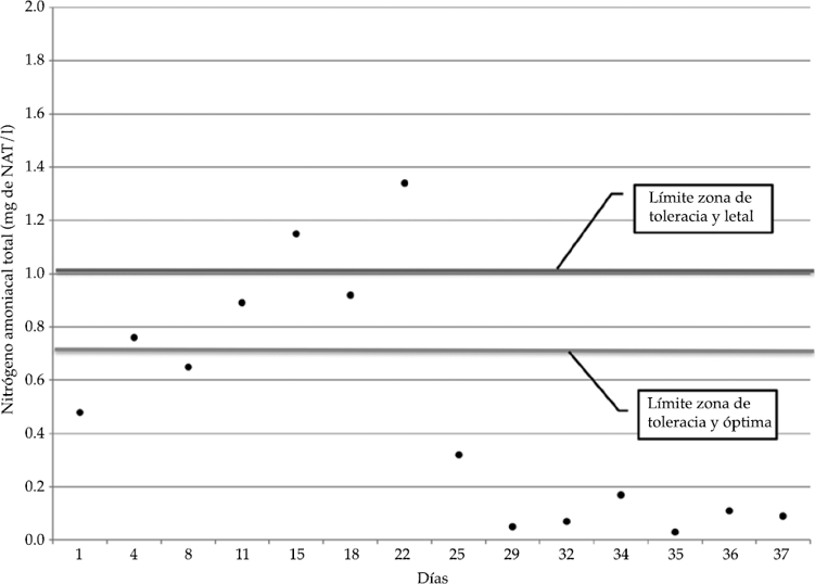 Figura 2 Comportamiento del nitrógeno amoniacal total en el tiempo de maduración del biofiltro. Limites óptimos, de tolerancia y letales tomados de García-Pulido et al. (2011).