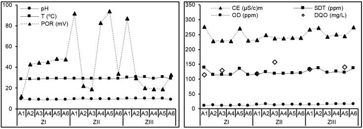 La temperatura del agua se comportó en el rango de 28.8 a 29.9 0C. Fue inferior al límite permitido por la normatividad mexicana (40 0C). El POR varió en las tres zonas, desde 5 mV en la zona I hasta 80 mV en la zona II. Por su parte, el OD presentó valores desde 7 hasta 11 mg l-1, similares a los límites (no menor a 5 mg l-1) propuestos por la EPA (EPA, 2000) y por la Guía canadiense de la calidad del agua (9.5 mg l-1). Mientras que para la CE fueron de 225 a 275 µS cm-1, valores por debajo de 2 500 µS cm-1, propuesto por la NOM-069-ECOL-1994, típicos de cuerpos de agua dulce. El intervalo resultante (105-155 mg O2 l-1) para DQO está, de acuerdo con la Conagua (2012), clasificada como contaminada (40 < DQO < 200) y para los SDT (114-137 mg l-1) son similares a los reportados por la Secretaría de Energía, Recursos Naturales y Protección Ambiental (Sernapam) en 2012 y 2013 (Tabla 1). Los parámetros fisicoquímicos se muestran en la Figura 4.