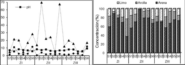 La granulometría para la zona I arrojó valores promedio de 67.2% de arena, 17.2% de arcilla y 15.4% de limo; la zona II fue de 75.4% de arena, 14.5% de arcilla y 10% de limo; la zona III, con 69.2% de arena, 16.1% de arcilla y 14.6% de limo, en referencia al triángulo de textura usado por el Departamento de Agricultura de Estados Unidos de América. Los resultados de las tres zonas corresponden a una clasificación textural que va de arenosa a franco arenosa moderadamente gruesa (USDA, 2014).