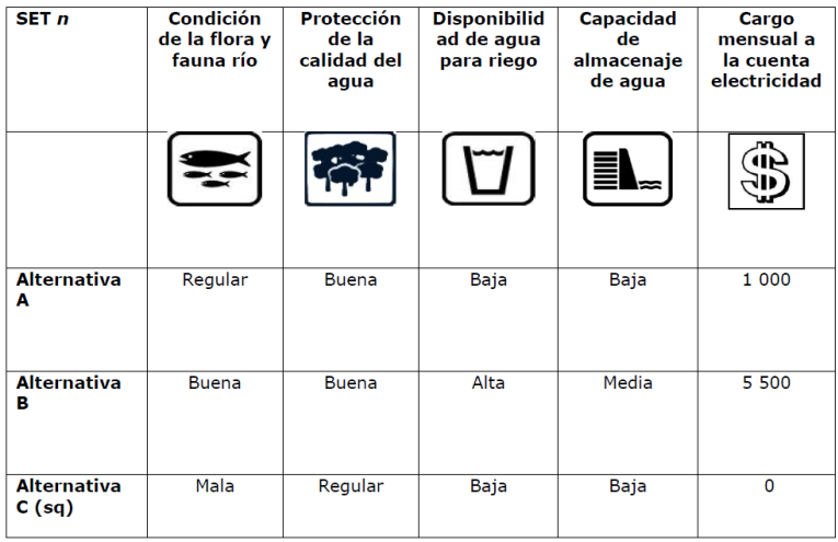 A través de reuniones y entrevistas con representantes de instituciones públicas e investigadores del área, junto con una revisión de la bibliografía local disponible (Cade Idepe Ingeniería y Desarrollo de Proyectos, Ltda., 2004; PUC, 2008; Conama, 2008; SISS, 2013), se seleccionaron cuatro atributos relacionados con los SE relevantes en la cuenca: (1) estado de conservación y protección de la flora y fauna del río; (2) protección de la calidad del agua en la cuenca; (3) disponibilidad de agua para riego, y (4) capacidad de almacenaje de agua a través de embalses (Tabla 1). La flora y fauna que habita en el río, como plantas acuáticas, peces, e insectos, son buenos indicadores de la calidad del agua, dado que ellos son sensibles a la contaminación. Es decir, una mejor condición de la flora y fauna significa una mejor calidad de agua del río. Actualmente, la condición de la flora y fauna en el río Aconcagua es “deficiente o mala” en general, con algunas variaciones por sector. Si hubiera un mejor monitoreo de la calidad del agua junto con más inversiones para proteger la calidad de ésta, la situación actual podría mejorar a una condición “regular” o “buena” a lo largo del río. Algunas medidas para mejorar y proteger la calidad del agua incluyen plantas de tratamiento de aguas servidas (PTAS) y la protección de riberas con vegetación. Actualmente, la mayoría de las comunas cuentan con plantas de tratamiento, encontrándose la cuenca en un nivel “regular” de protección de la calidad de agua. Sin embargo, aún hay sectores poblados sin este servicio y no existen programas para proteger las riberas con vegetación. La implementación de nuevas inversiones podría permitir mejorar la calidad del agua en el territorio a un nivel “bueno” o “muy bueno”.