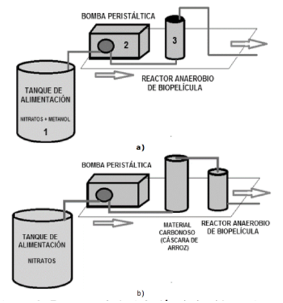 Se construyeron dos modelos similares de reactores, difiriendo en la fuente de carbono que se adiciona, para que se produzca el proceso de desnitrificación; uno de los sistemas trabajó con metanol y el otro lo hizo con una fuente orgánica de sustrato: la cáscara de arroz.
