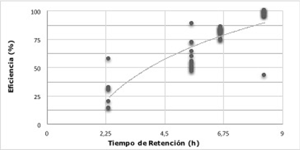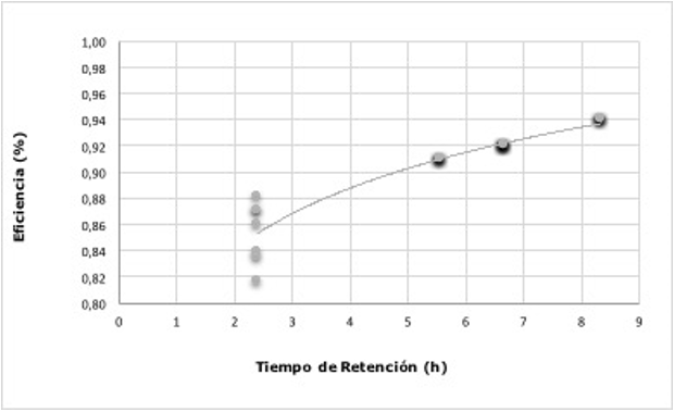 El R1 presenta además valores de eficiencia de remoción de material orgánico satisfactorios. El rango de eficiencias de remoción de material orgánico es de 82 a 94%, a tiempos de retención de 2.38 a 8.33 horas, respectivamente, con un valor promedio de 91%, valores que pueden observarse en la Figura 4.