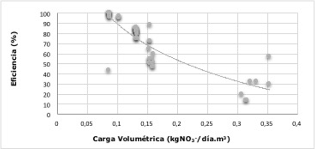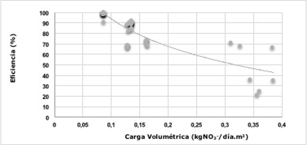 Al ser la eficiencia de remoción de nitratos inversamente proporcional al caudal, la carga volumétrica también lo es, obedeciendo a una curva logarítmica, que se aprecia en la Figura 3.