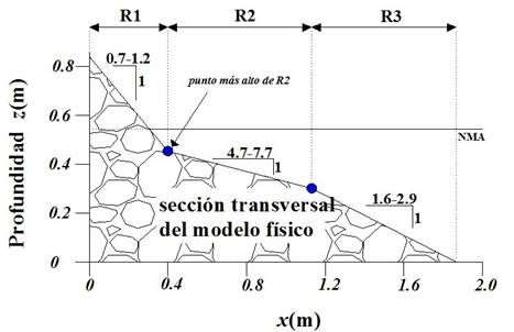 Cabe destacar que en el inciso a), la restricción 2 < R2 / H < 5, en conjunto con alguno de los valores de pendiente que se elija para la zona R2, se asegura que el punto más alto de R2 no cruce el nivel medio del agua.