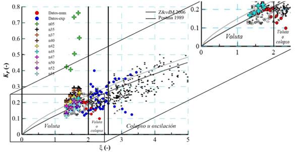 Se realizó una comparación entre los resultados numéricos obtenidos y datos de coeficientes de reflexión estimados en los trabajos experimentales de Quiñones (2006), y los presentados en Zanuttigh y van der Meer (2008); dicha comparación se muestra en la Figura 10. En ella se puede observar que los resultados numéricos están dentro del rango de variación de los obtenidos en el modelo físico. Cabe mencionar que el tipo de rotura es de tipo voluta para la mayoría de los datos numéricos, mientras que los datos experimentales, en su mayor parte, presentan una rotura tipo colapso (surging-waves). Es importante señalar que los datos numéricos dibujados en la Figura 10 son los obtenidos para el valor de porosidad de 0.45.