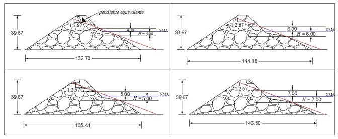 A partir de esta metodología de diseño geométrico se propusieron cuatro alturas de ola de diseño (H = 4, 5, 6 y 7 m), con lo que se obtuvieron las secciones transversales mostradas en la Figura 2. Además, en dicha figura también se pueden observar los valores elegidos para las pendientes de las tres regiones del DRPS-S, es decir R1, R2 y R3.