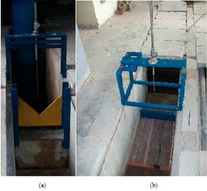 Para las mediciones de la carga hidráulica tanto sobre el vertedor de aforo como sobre el cimacio objeto de estudio se emplearon miras hidráulicas de precisión ± 0.1 mm. Se muestra imágenes de las mismas y sus ubicaciones en la Figura 5.