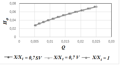 Siguiendo el procedimiento arriba descrito fue posible obtener para cada grado de truncado del cimacio un gráfico en el que se muestran tres curvas de capacidad de servicio: una para el cimacio sin truncado, una segunda para el cimacio truncado y lámina ventilada, y una tercera para cimacio truncado y lámina sin ventilar. En la Figura 9 y Figura 10 se muestran dos ejemplos correspondientes a cimacios WES y elíptico, respectivamente (Carralero, 2016).