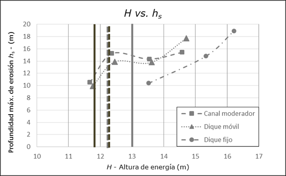 En la Figura 10 se observa que el cambio en las relaciones h s -H se da entre valores de H de 12.4 y 13.6 m para ambas estructuras. El valor de este parámetro para la hipótesis 1 es de 12.3 m tanto para el canal moderador como para el dique móvil y para la hipótesis 2 es de 11.8 m y 13 m, respectivamente.