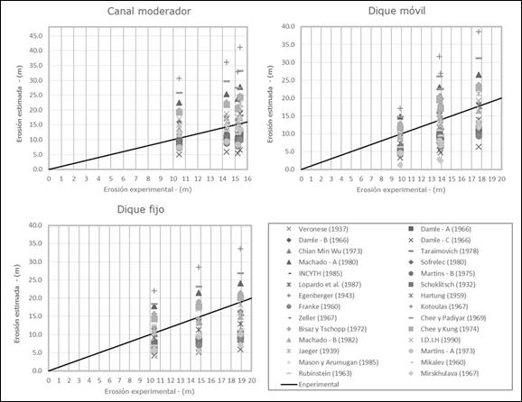 Figura 11 Diagrama de comparación entre las erosiones experimentales y las estimaciones empíricas: a) canal moderador, b) dique móvil y c) dique fijo.