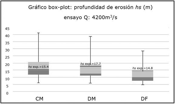 En la Figura 12 se muestra un gráfico Box-Plot, en el cual se presentan los resultados para las tres estructuras. Se puede observar que el resultado experimental para el canal moderador se encuentra próximo al segundo cuartil (Q2), y que los valores experimentales correspondientes al dique móvil y el dique fijo se ubican próximos al tercer cuartil (Q3). Se concluye que la máxima profundidad de erosión no sólo varía con las condiciones sedimentológicas, las cuales en este caso permanecen constantes para las tres estructuras, sino también de la hidráulica de cada obra en particular.