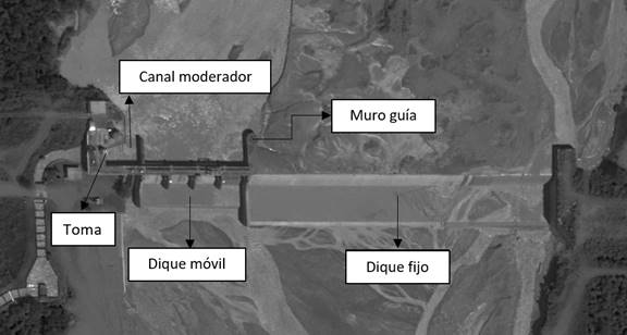 El caso de estudio es el dique de derivación Los Molinos, ubicado en la provincia de Jujuy, Argentina (UNC, 2012). Esta obra está emplazada sobre el río Grande, aguas arriba de la ciudad de San Salvador de Jujuy y aproximadamente a 1 km aguas abajo de su confluencia con el río Reyes (Figura 1). El dique derivador está conformado por tres estructuras de descarga: sobre la margen izquierda del cauce se ubica un azud fijo (dique fijo, DF), el cual se encuentra separado de las estructuras móviles por un muro guía; las estructuras móviles consisten en un vertedero controlado por cuatro compuertas de sección circular (dique móvil, DM), y un descargador de fondo o canal moderador (CM), regulado por dos compuertas planas; finalmente, sobre la margen derecha de la presa se encuentra la obra de toma (Figura 2).