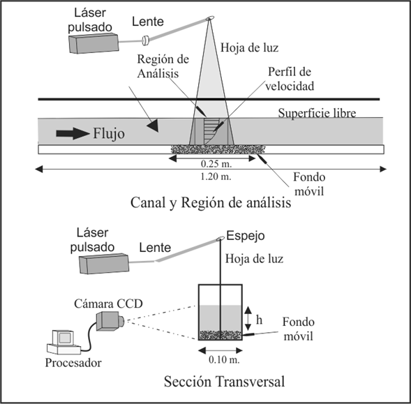 Las dimensiones del canal de laboratorio donde se realizaron las simulaciones del inicio de movimiento del lecho de fondo móvil son 1.20 m de longitud, 0.10 m de ancho y altura de las paredes laterales de 0.15 m. A 0.60 m de la entrada del canal se ubica un depósito de fondo móvil de 0.025 m de profundidad y 0.25 m de longitud. Las partículas de arena, o fondo móvil, se colocaron en dicho depósito verificando que el lecho presentara siempre una configuración plana al inicio de cada experimento. En la salida del canal, una compuerta permitió controlar la velocidad del flujo, manteniendo un caudal constante durante cada experimento. En la Figura 2 se muestra el esquema del dispositivo canal-depósito de fondo móvil y la configuración del sistema de velocimetría por rastreo de partículas empleado (PTV).