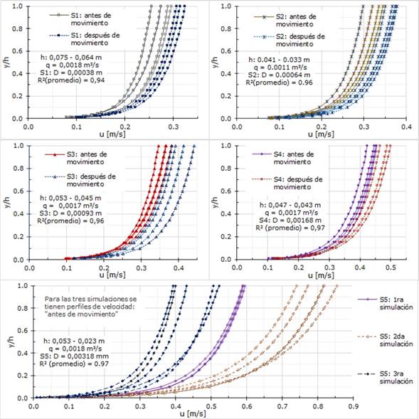 Donde y es la altura de flujo (m); u, la velocidad promedio para la altura y (m/s); A y b0 son las constantes del modelo de regresión. En cada caso, la región tomada en cuenta para aplicar el modelo de regresión fue acotada con base en la ventana donde se obtiene el mejor coeficiente de determinación R2 posible, definiéndose así la región de flujo en la vertical donde se garantiza que la distribución de velocidades sigue la ley logarítmica (región de flujo turbulento). La amplitud de dicha región depende sobre todo de la profundidad h en cada medición, profundidad que, como se mencionó, fue controlada por pequeños incrementos de apertura de la compuerta a la salida del canal. Una serie experimental o simulación de inicio de movimiento implicó un conjunto de mediciones desde una condición de flujo próxima al inicio de movimiento del lecho hasta una condición donde el arrastre de los granos del fondo fue indiscutible. Así, en cada simulación se tienen mediciones “antes de movimiento” y “después de movimiento”. Los gráficos insertos en la Figura 4 muestran ejemplos de una de las simulaciones por cada fondo móvil, excepto para S5, para el cual se presentan las tres simulaciones realizadas.
