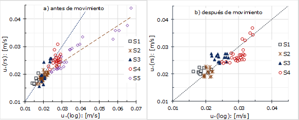 Figura 5 Comparación: velocidad de corte obtenida por la ley logarítmica u * (log) versus velocidad de corte obtenida por los esfuerzos de Reynolds u * (rs); a) antes de inicio de movimiento del lecho; b) después de movimiento del lecho.