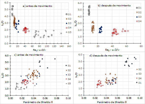 Tabla 4 Rugosidad equivalente de lecho (ks/D) antes y después de movimiento (valores promedio y rango de los resultados).