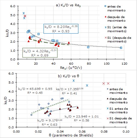 Figura 7 Modelos de regresión obtenidos para el promedio de la rugosidad equivalente (k s /D) antes y después del inicio de movimiento: a) k s /D vs. Re p ; b) k s /D vs. θ.