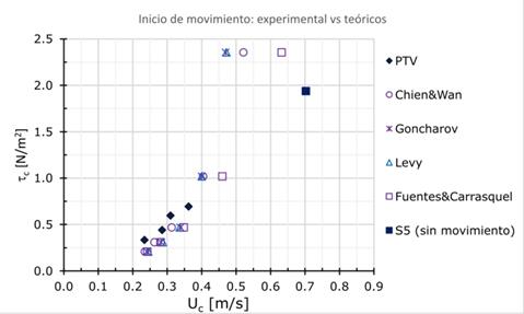 Las velocidades medias críticas experimentales (obtenidas por PTV) para S1 y S2 son cercanas a las calculadas por los cuatro modelos considerados. No obstante, para estos mismos fondos, los esfuerzos cortantes críticos experimentales son mayores a los obtenidos por el modelo de Shields. En los casos S3 y S4, las velocidades críticas calculadas son mayores que las observadas de modo experimental, mientras los correspondientes esfuerzos cortantes experimentales son mayores en el caso S3 y menores para S4. En el lecho S5, aún cuando experimentalmente la máxima velocidad medida es mayor que la calculada por cualquiera de los cuatro modelos considerados, el esfuerzo cortante que corresponde a esta velocidad máxima (0.703 m/s) es menor que el propuesto por el modelo de Shields. También para esta condición se tiene Fr > 1 (ver Tabla 1), en tal combinación velocidad-profundidad, la energía específica del flujo durante el experimento disminuye conforme aumenta la velocidad y decrece la profundidad. El gráfico mostrado en la Figura 9 contiene el comparativo entre los parámetros críticos experimentales y los criterios teóricos considerados contenidos en la Tabla 5.