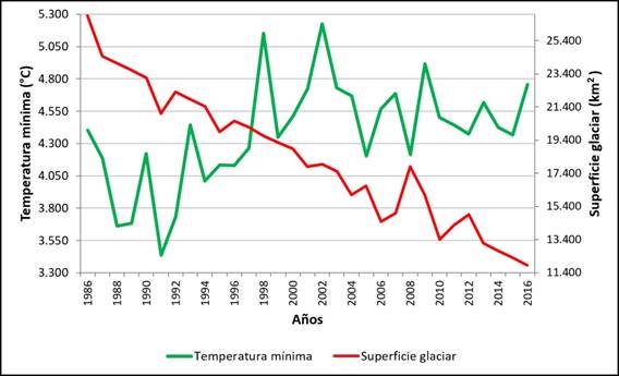 Entre 1986 y 2016 se evidencia un aumento para las temperaturas mínima y media anual en la zona de estudio; este incremento es más alto para la temperatura mínima, mostrando valores de 3.435 a 5.227 °C; se estima al 2016 un valor de 4.757 °C (Figura 2); de igual forma, la superficie de la masa glaciar de la Cordillera Huaytapallana muestra en este mismo periodo una tendencia de retroceso, estimado al 2016 en 11.86 km2 de extensión (Figura 2)