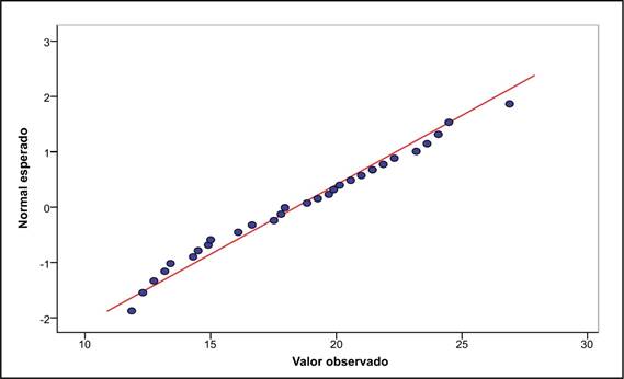 En la Figura 3 se observa que la muestra de puntuaciones se distribuye normalmente, pues los puntos del diagrama Q-Q normal se ajustan a la recta diagonal.