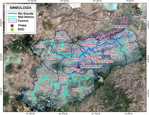 La cuenca hidrológica hasta la EHC El Plan, clave 12588 (19° 49’ 10’’ N y 101° 00’ 40’’ O), se localiza en la porción noroeste del estado de Michoacán y abarca un área de 1 578.36 km2. A su vez, la cuenca se dividió en 14 subcuencas, tal como se presentan en la Figura 1.