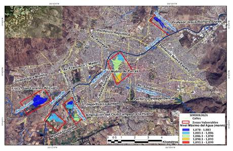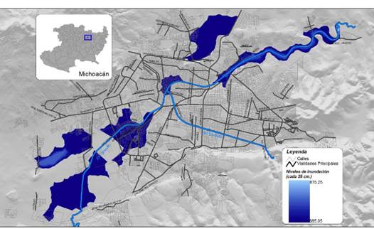 Las zonas vulnerables determinadas en esta investigación corresponden a los periodos de retorno de 100 y 500 años. Corona-Morales (2009) reporta lo publicado en el Atlas de Riesgos de Morelia (Figura 10), en el que se utiliza un modelo de distribución de la lámina de agua a cada 25 cm; ello se llevó a cabo mediante un análisis de cotas y la identificación de zonas que resultaron inundadas en 2003; cabe señalar que en ese trabajo no se usó un modelo lluvia-escurrimiento; pero al tratarse de una tormenta observada y la identificación de zonas afectadas, se logró considerar problemas derivados por el estancamiento del agua a consecuencia de la obstrucción por basura y desechos; evidentemente, las áreas en su mayoría no coinciden con lo determinado en este trabajo.